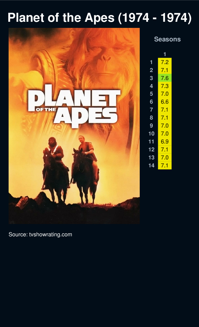 Two astronauts and a sympathetic chimp friend are fugitives in a future Earth dominated by a civilization of humanoid apes. Based on the 1968 Planet of the Apes film and its sequels, which were inspired by the novel of the same name by Pierre Boulle.