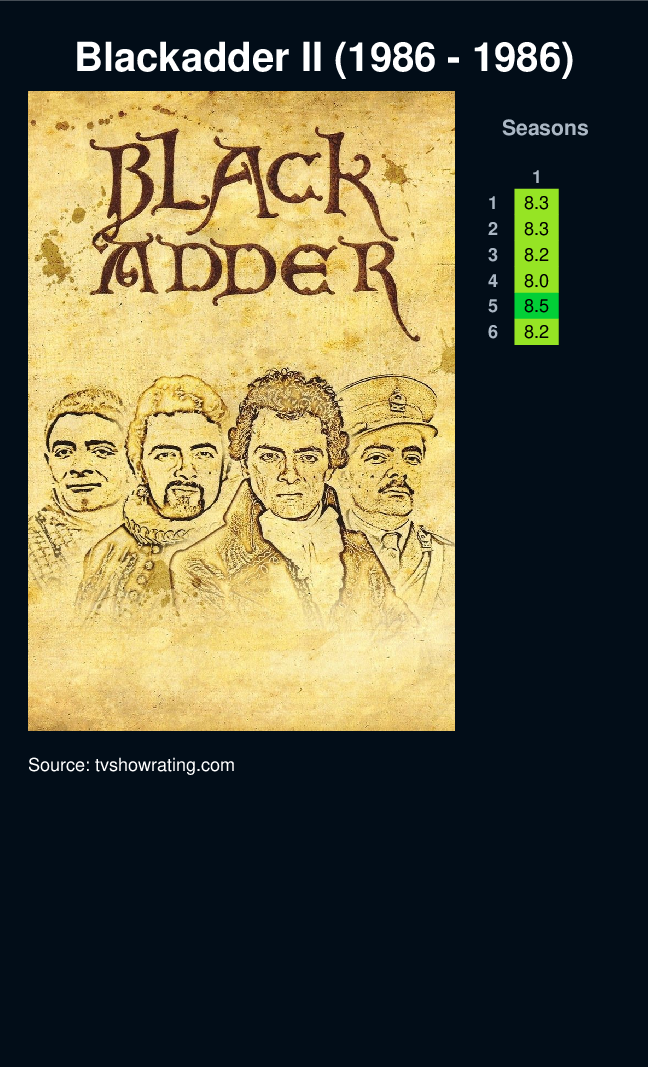 Blackadder traces the deeply cynical and self-serving lineage of various Edmund Blackadders throughout British history, from the muck of the Middle Ages to the frontline of The Great War.