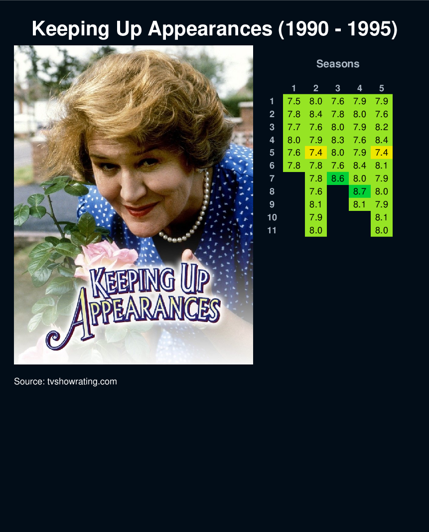 Hyacinth Bucket (whose name, she insists, is pronounced "Bouquet") is a suburban housewife in the West Midlands. She would be the first to tell you that she is a gracious hostess, a respected citizen, and a well-connected member of high society. If you don't believe that, just ask her best friend Elizabeth, held captive in Hyacinth's kitchen; or the postmen and neighbours who bristle at the sound of her voice; or Richard, her weary and compliant husband. In fact, Hyacinth's reputation could be as perfect as her new lounge set, if not for her senile father's love of running wild in the nip. Oh, and she would prefer it if her brother-in-law was a sharper dresser. And that her husband was more ambitious. And that her sisters were more presentable. And do take your shoes off before you come in the house, dear. Mind that you don't brush against the wallpaper.