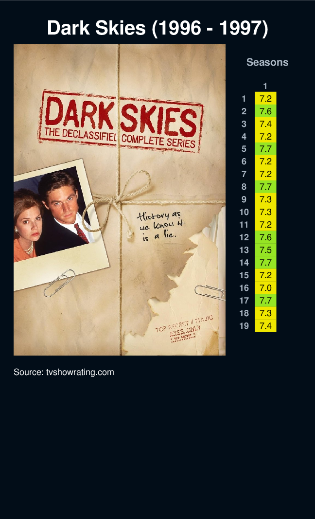 Dark Skies is an American UFO conspiracy theory-based sci-fi television series that aired from the 1996 to 1997 season for 18 episodes, plus a two-hour pilot episode. The success of The X-Files on Fox proved there was an audience for science fiction shows, resulting in NBC commissioning this proposed competitor following a pitch from producers Bryce Zabel and Brent Friedman. The series debuted September 21, 1996 on NBC, and was later rerun by the Sci-Fi Channel. Its tagline was "History as we know it is a lie."