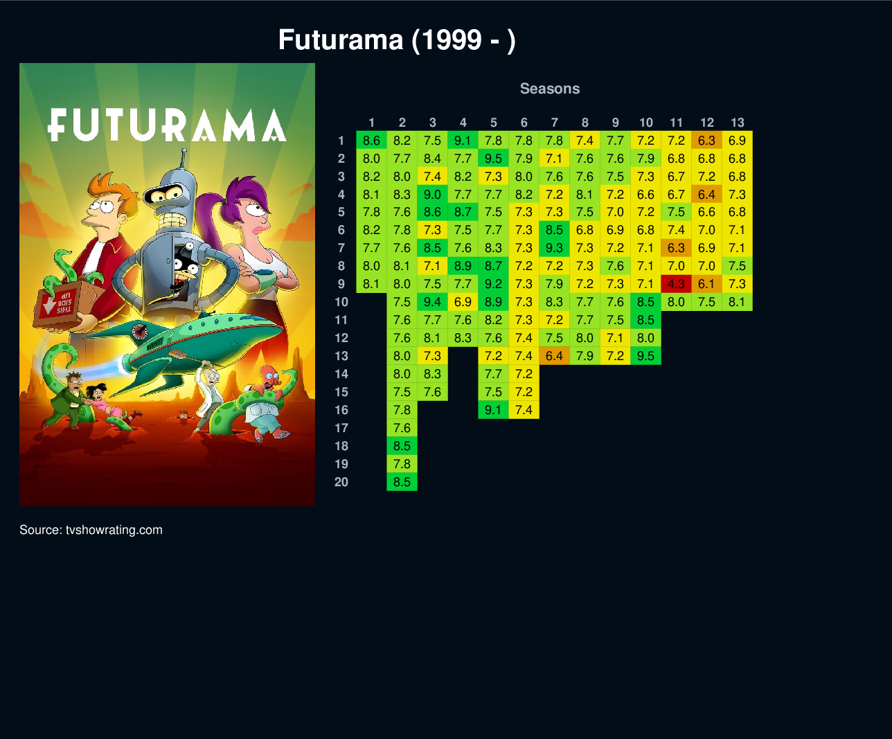 | 14 | 8.0 | 8.3 | 7.7 | 7.2 | |||||||||||||||||||||||||||||||||||||||||||||