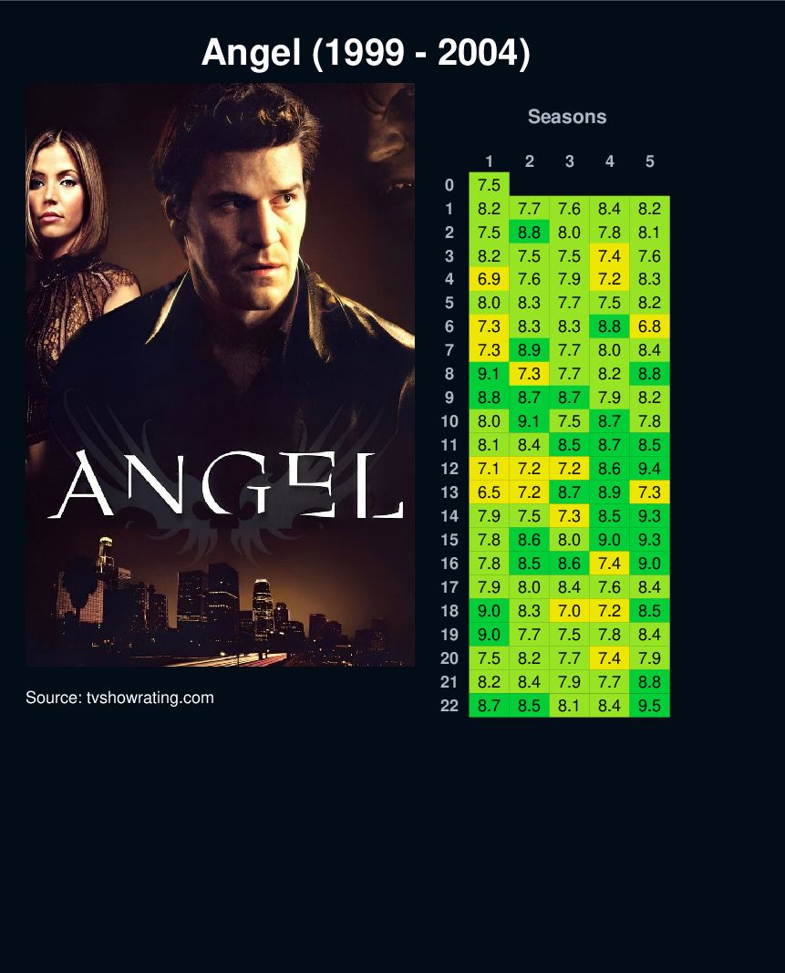The vampire Angel, cursed with a soul, moves to Los Angeles and aids people with supernatural-related problems while questing for his own redemption. A spin-off from Buffy the Vampire Slayer.