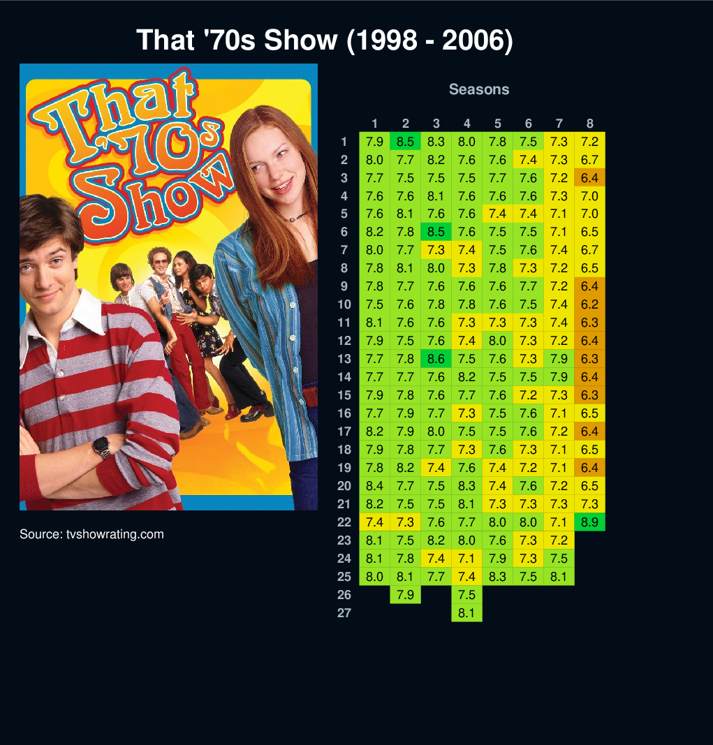 | 7 | 8.0 | 7.7 | 7.3 | 7.4 | 7.5 | 7.6 | 7.4 | 6.7 | |||||||||||||||||||||||||||||||||||||||||