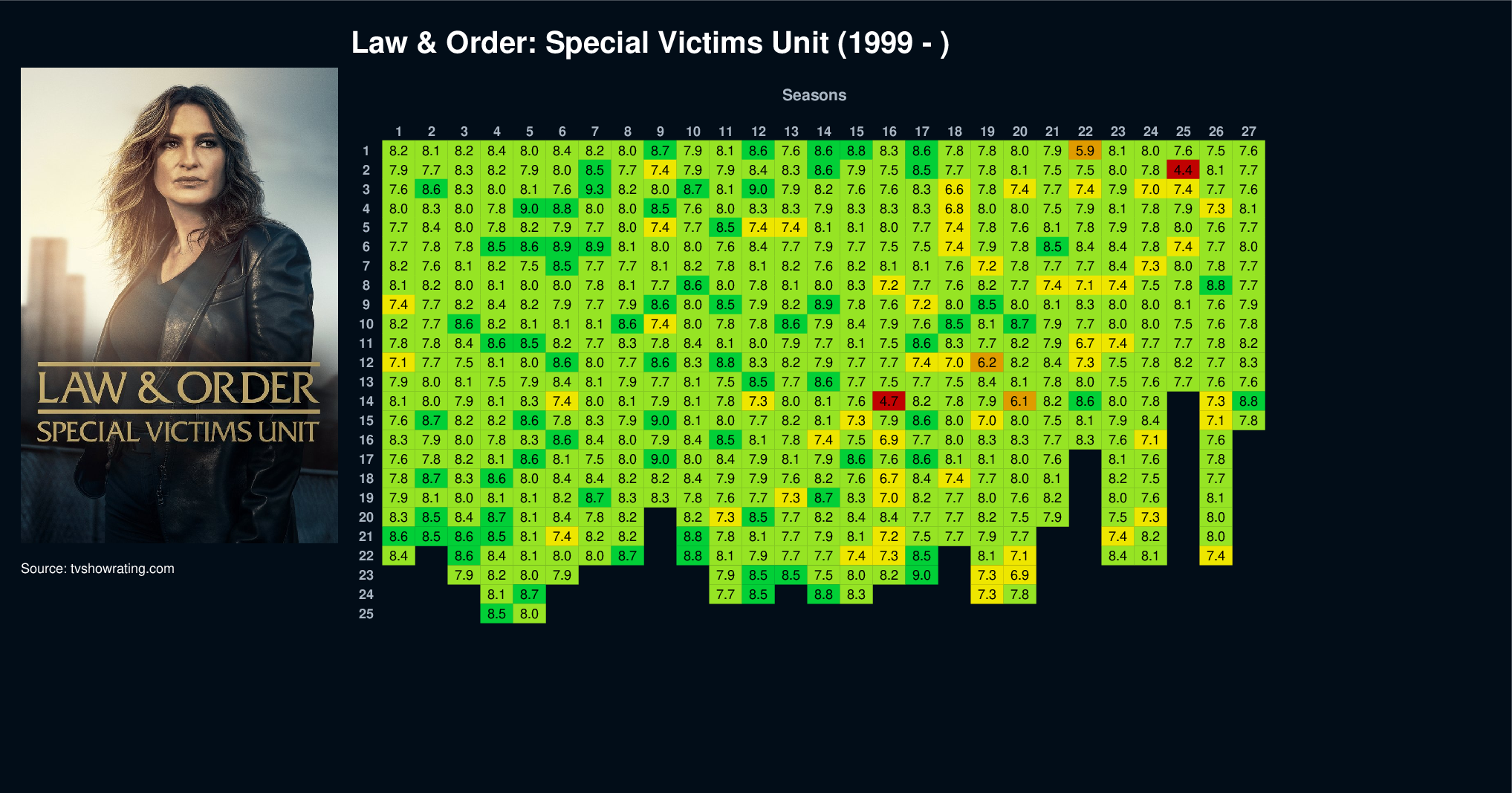 | 18 | 7.8 | 8.7 | 8.3 | 8.6 | 8.0 | 8.4 | 8.4 | 8.2 | 8.2 | 8.4 | 7.9 | 7.9 | 7.6 | 8.2 | 7.6 | 6.7 | 8.4 | 7.4 | 7.7 | 8.0 | 8.1 | 8.2 | 7.5 | 7.7 | |||||||||||||||||||||||||