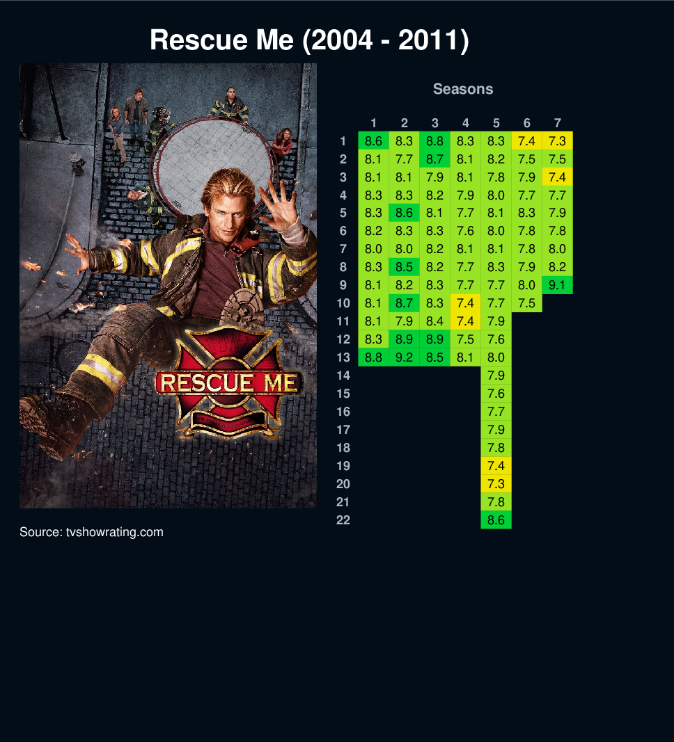 Rescue Me revolves around the lives of the men in a New York City firehouse, the crew of 62 Truck. Examining the fraternal nature and relationships of firefighters, the series tackles the daily drama of the life-and-death situations associated with being a firefighter, while exploring the ways the men use dark humor to protect their true emotions.