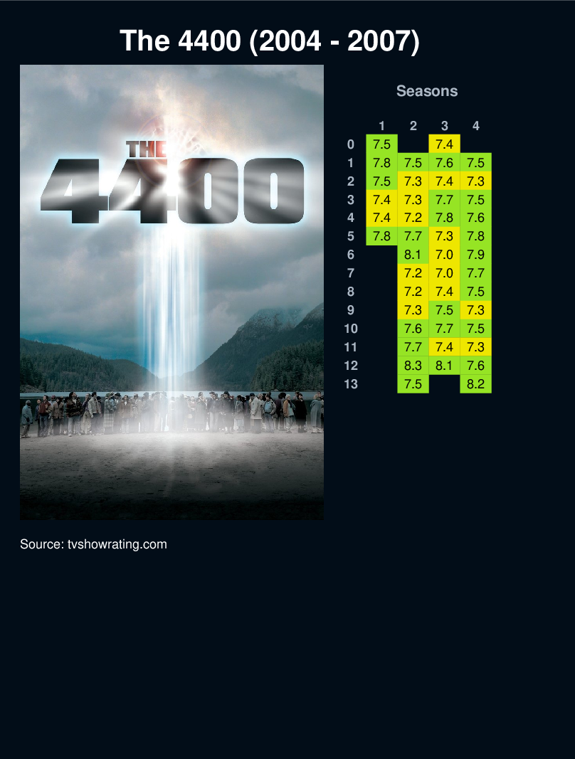 4400 centers on the return of 4400 people who, previously presumed dead or reported missing, reappear on Earth. Though they have not aged physically, some of them seem to have deeper alterations ranging from superhuman strength to an unexplained healing touch. A government agency is formed to track the 4400 people after one of them commits a murder.