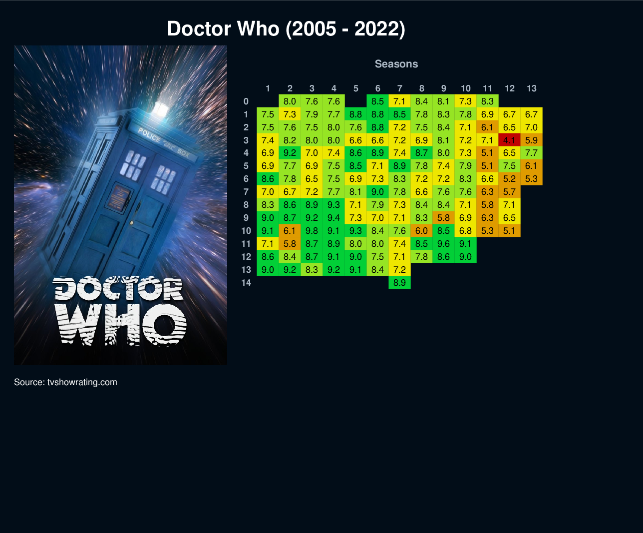 | 13 | 9.0 | 9.2 | 8.3 | 9.2 | 9.1 | 8.4 | 7.2 | ||||||||||||||||||||||||||||||||||||||||||