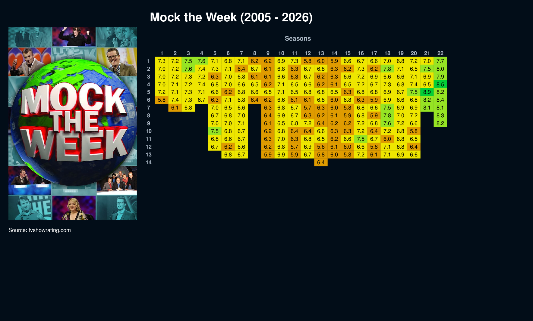 | 8 | 6.7 | 6.8 | 7.0 | 6.4 | 6.9 | 6.7 | 6.3 | 6.2 | 6.1 | 5.9 | 6.8 | 5.9 | 7.8 | 7.0 | 7.2 | 8.3 | |||||||||||||||||||||||||||||||||