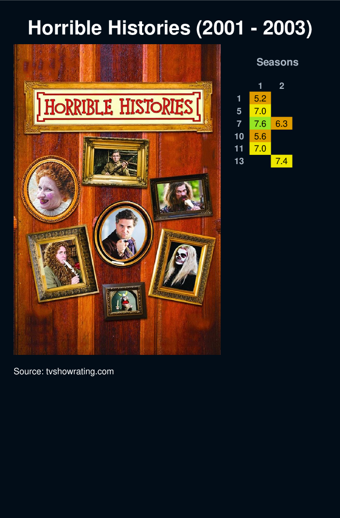Based on the best-selling children's books and liberally splattered with guts, blood and poo, a group of British comedians offer an anarchic and unconventional take on some of history's most gruesome and funny moments, with topics including the Stone Age, the Middle Ages, the Egyptians and the Romans, among others.