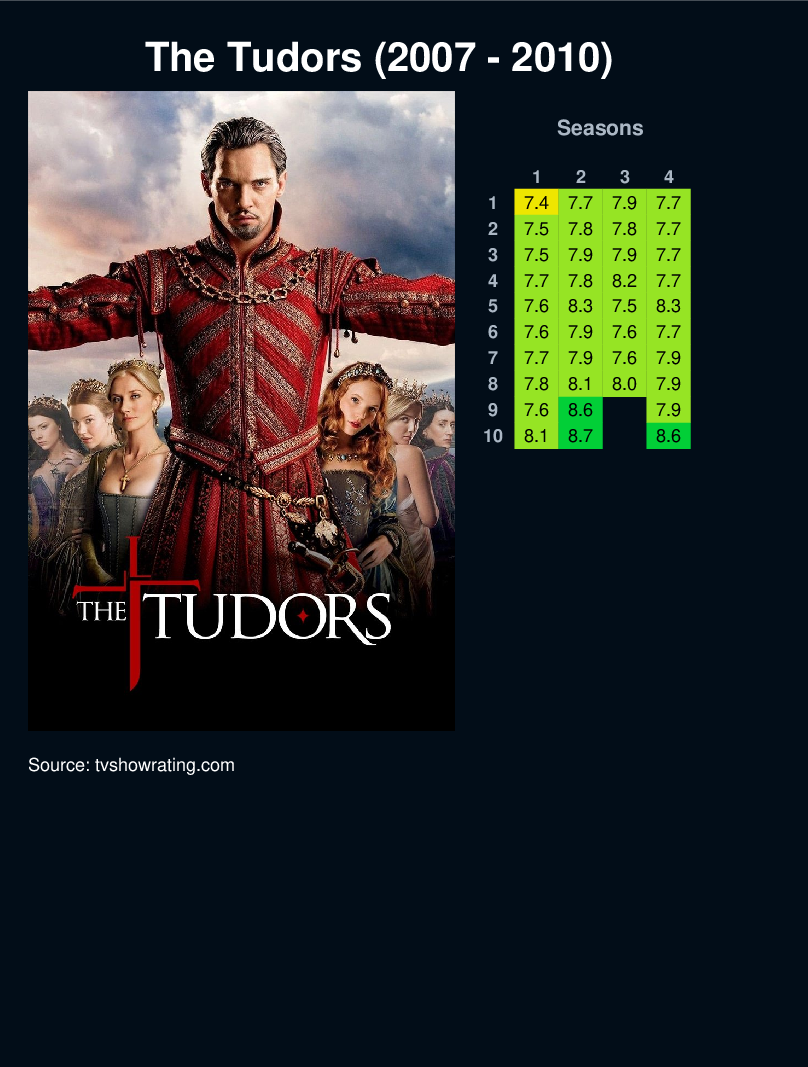 The Tudors is a history-based drama series following the young, vibrant King Henry VIII, a competitive and lustful monarch who navigates the intrigues of the English court and the human heart with equal vigor and justifiable suspicion.