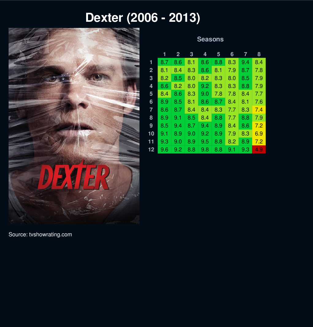 Dexter Morgan, a blood spatter pattern analyst for the Miami Metro Police also leads a secret life as a serial killer, hunting down criminals who have slipped through the cracks of justice.