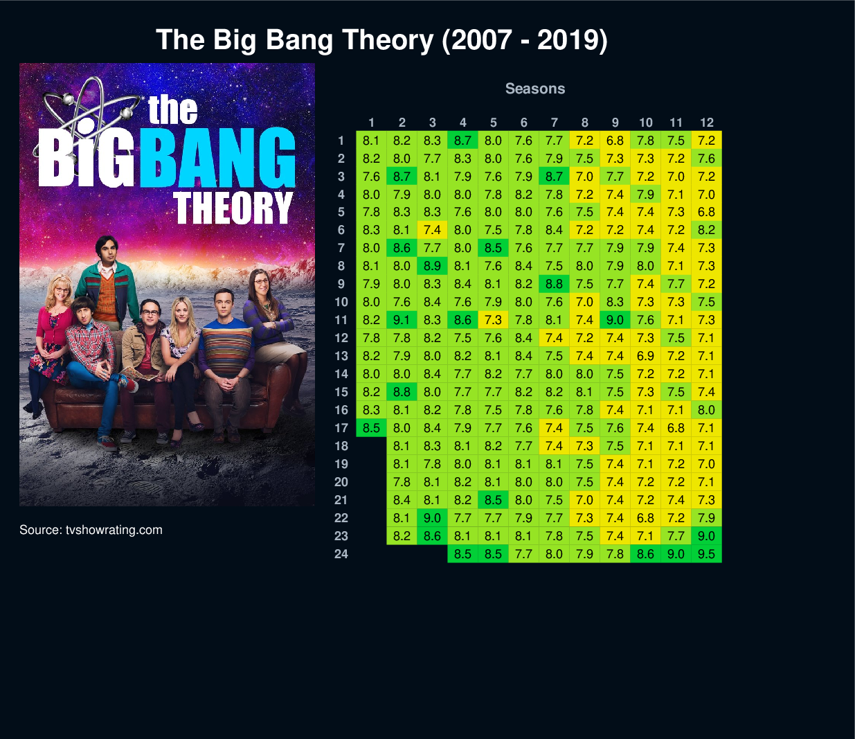 | 5 | 7.8 | 8.3 | 8.3 | 7.6 | 8.0 | 8.0 | 7.6 | 7.5 | 7.4 | 7.4 | 7.3 | 6.8 | |||||||||||||||||||||||||||||||||||||
