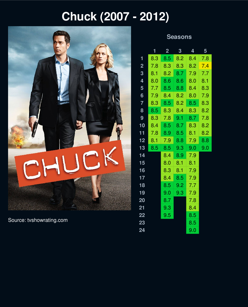 When Buy More computer geek Chuck Bartowski unwittingly downloads a database of government information and deadly fighting skills into his head, he becomes the CIA's most vital secret. This sets Chuck on a path to become a full-fledged spy.