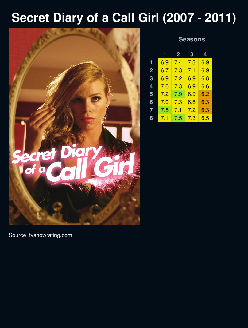 It's her business doing pleasure with you. A witty and provocative series based on the real-life adventures of a high-class escort. Juggling her own reality with her clients' fantasies can be difficult, but this savvy sweetheart knows every trick in the book, and she's doing it in style.