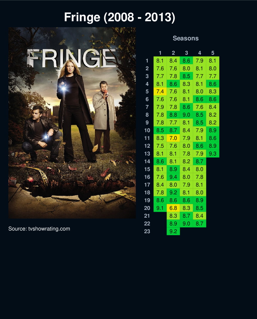 FBI Special Agent Olivia Dunham, brilliant but formerly institutionalized scientist Walter Bishop and his scheming, reluctant son Peter uncover a deadly mystery involving a series of unbelievable events and realize they may be a part of a larger, more disturbing pattern that blurs the line between science fiction and technology.