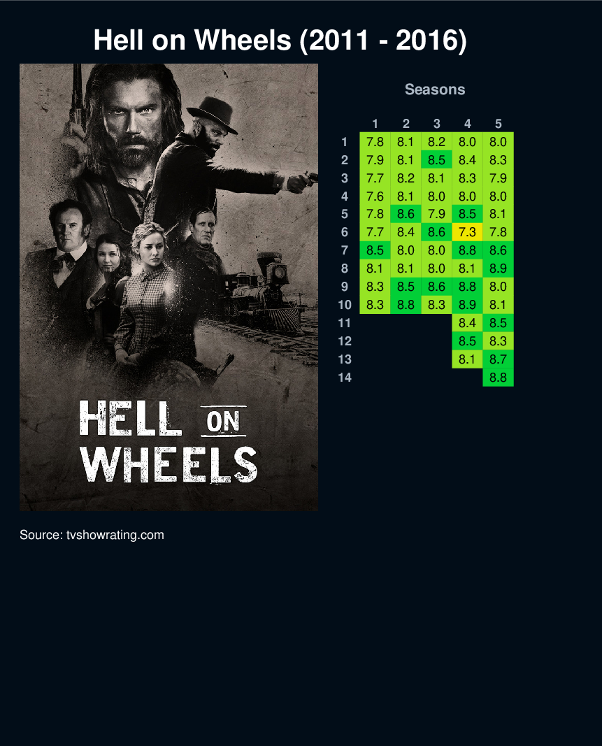 The epic story of post-Civil War America, focusing on Cullen Bohannon, a Confederate soldier who sets out to exact revenge on the Union soldiers who killed his wife. His journey takes him west to Hell on Wheels, a dangerous, raucous, lawless melting pot of a town that travels with and services the construction of the first transcontinental railroad, an engineering feat unprecedented for its time.