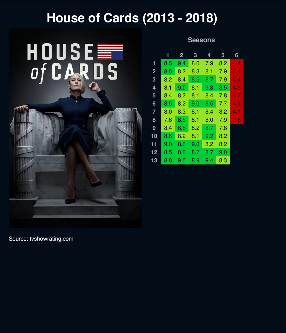 Set in present day Washington, D.C., House of Cards is the story of Frank Underwood, a ruthless and cunning politician, and his wife Claire who will stop at nothing to conquer everything. This wicked political drama penetrates the shadowy world of greed, sex and corruption in modern D.C.