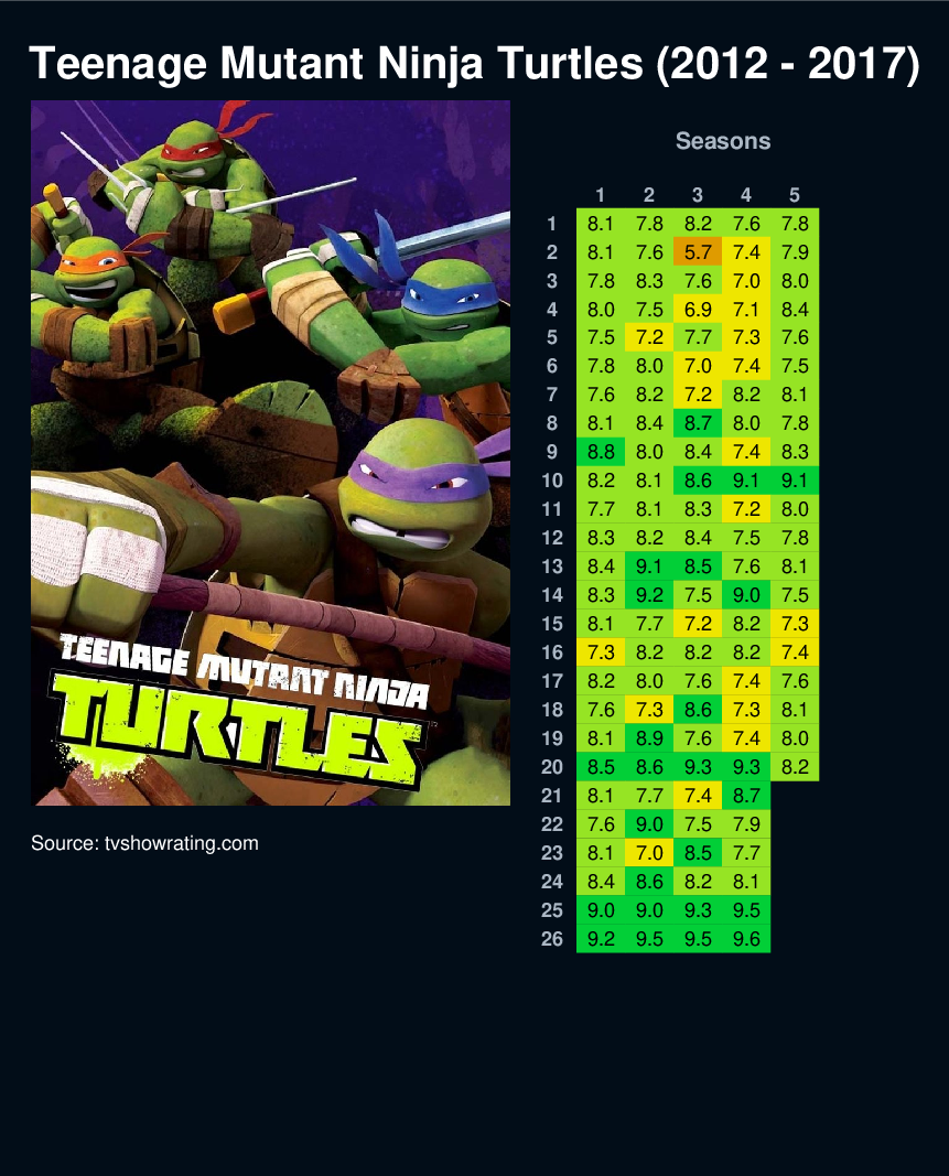 The Teenage Mutant Ninja Turtles are back in an all-new animated series on Nickelodeon! Surfacing topside for the first time on their fifteenth birthday, the titular turtles, Leonardo, Michelangelo, Raphael and Donatello, find that life out of the sewers isn't exactly what they thought it would be. Now the turtles must work together as a team to take on new enemies that arise to take over New York City.