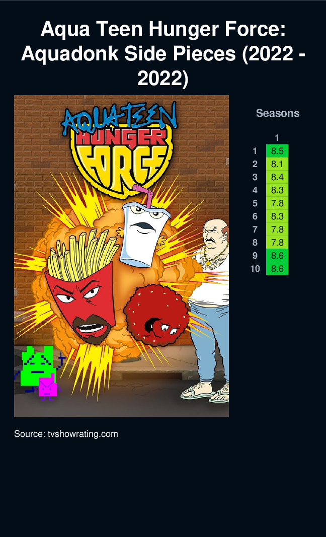 The surreal adventures of three anthropomorphic fast food items: Master Shake, Frylock and Meatwad, and their human nextdoor neighbor, Carl Brutananadilewski.