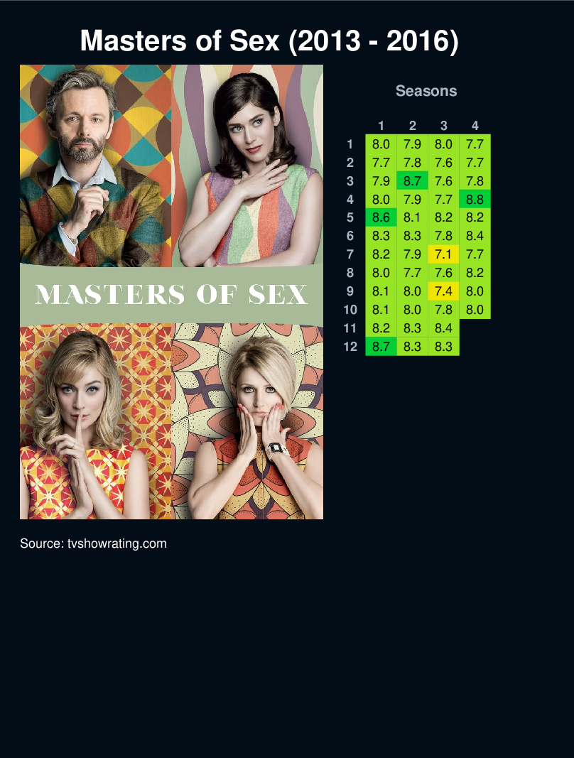 William Masters and Virginia Johnson are real-life pioneers of the science of human sexuality. Their research touched off the sexual revolution and took them from a midwestern teaching hospital to the cover of Time magazine and multiple appearances on Johnny Carson's couch. He is a brilliant scientist out of touch with his own feelings, and she is a single working mother ahead of her time. The series chronicles their unusual lives, romance, and unlikely pop culture trajectory.