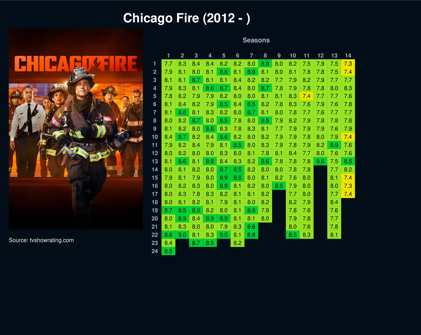 | 1 | 7.7 | 8.3 | 8.4 | 8.4 | 8.2 | 8.2 | 8.0 | 8.9 | 8.0 | 8.2 | 7.5 | 7.9 | 7.5 | 7.3 | |||||||||||||||||||||||||||||||||||
