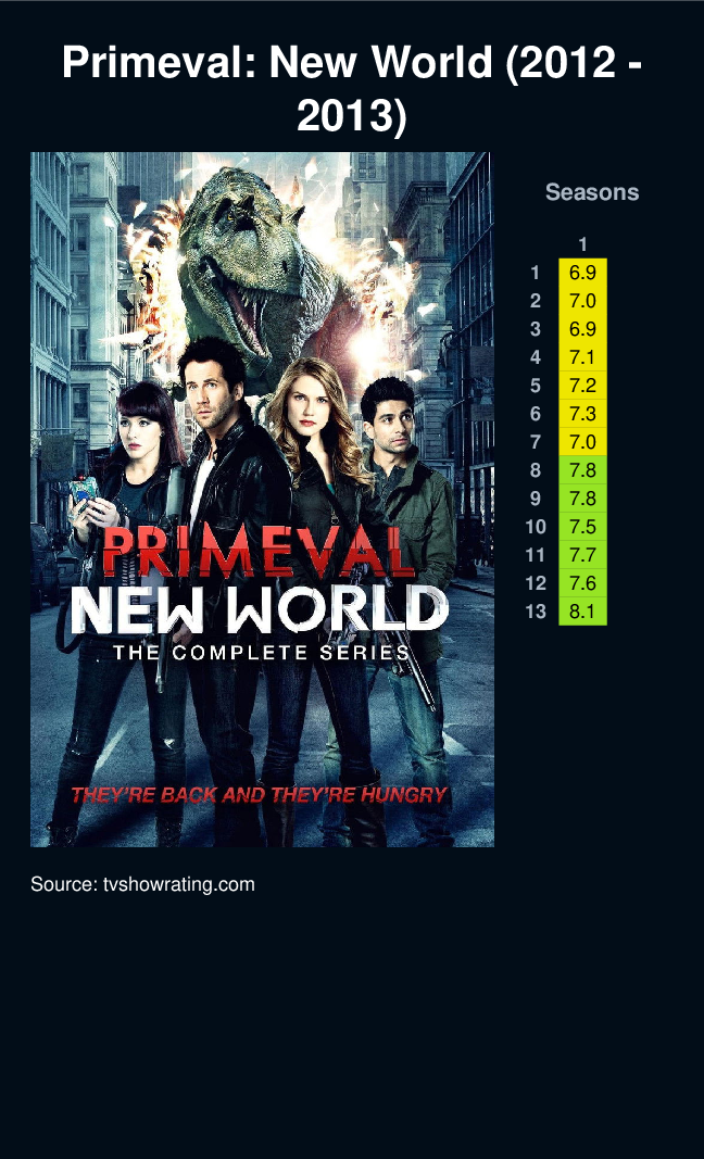 A North American spin-off of the hit U.K. television series, Primeval: New World follows a specialized team of animal experts and scientists that investigates the appearance of temporal anomalies and battles both prehistoric and futuristic creatures.