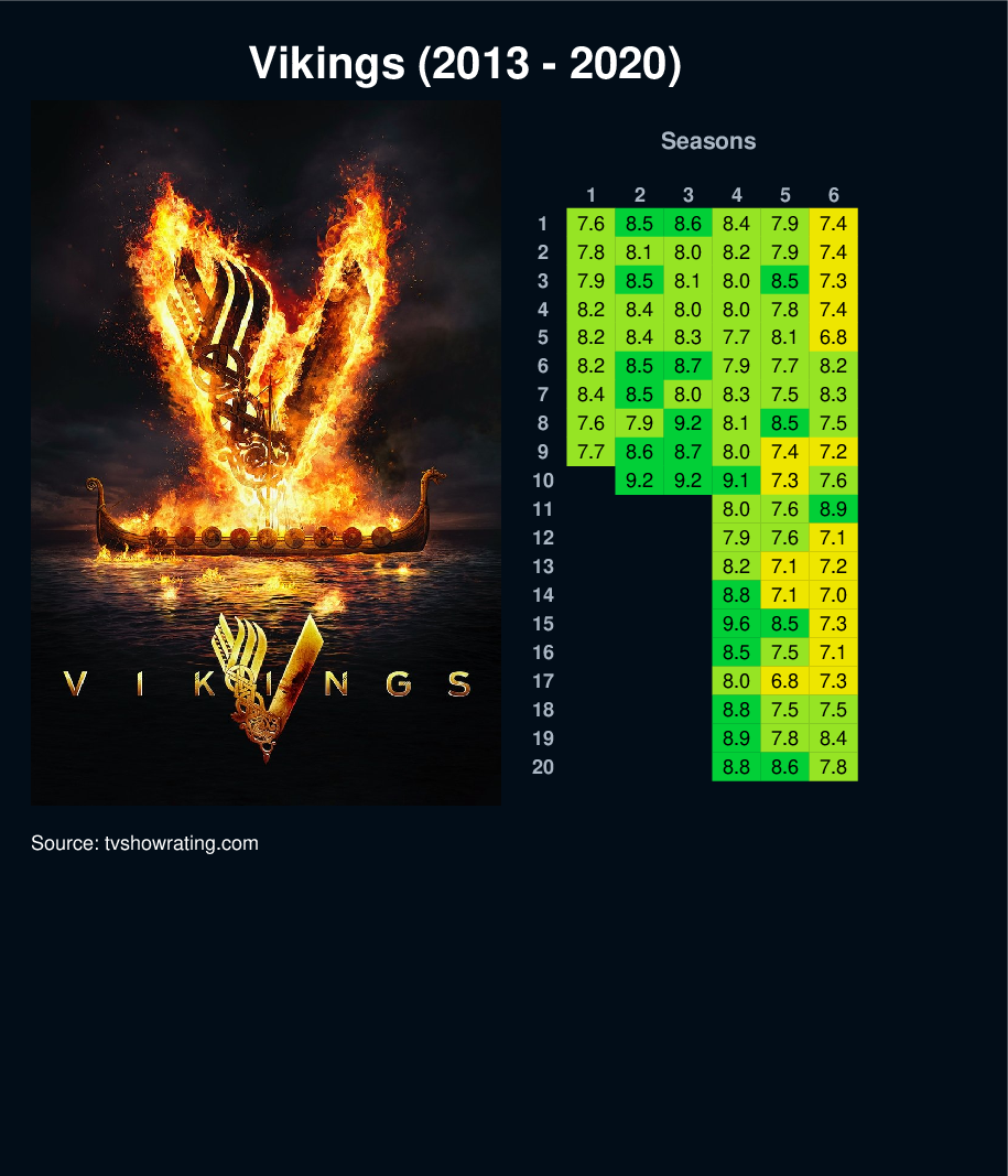 The adventures of Ragnar Lothbrok, the greatest hero of his age. The series tells the sagas of Ragnar's band of Viking brothers and his family, as he rises to become King of the Viking tribes. As well as being a fearless warrior, Ragnar embodies the Norse traditions of devotion to the gods. Legend has it that he was a direct descendant of Odin, the god of war and warriors.