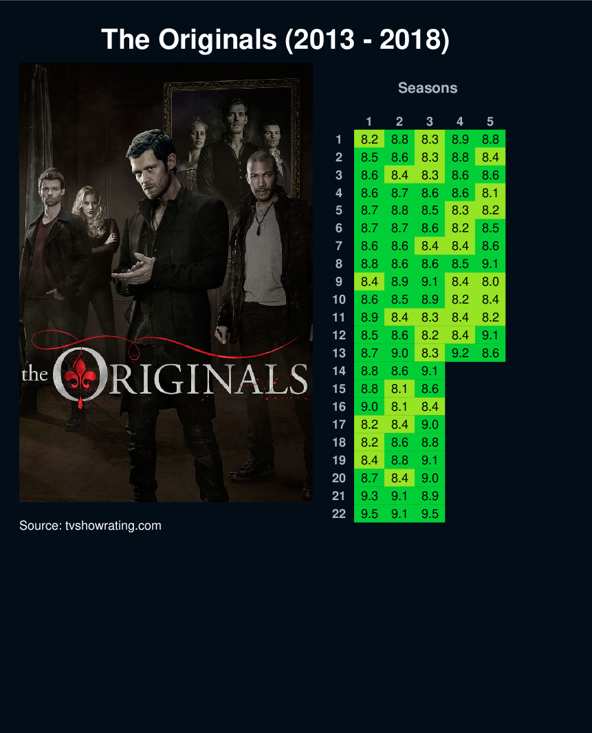The Vampire Diaries spin-off that follows the Mikaelsons, a family of millennia-old, power-hungry vampires who want to reclaim the city they built, New Orleans, and dominate all those who have wronged them.