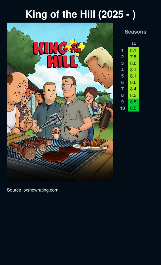 Set in Texas, this animated series follows the life of propane salesman Hank Hill, who lives with his overly confident substitute Spanish teacher wife Peggy, wannabe comedian son Bobby, and naive niece Luanne. Hank has conservative views about God, family, and country, but his values and ethics are often challenged by the situations he, his family, and his beer-drinking neighbors/buddies find themselves in.