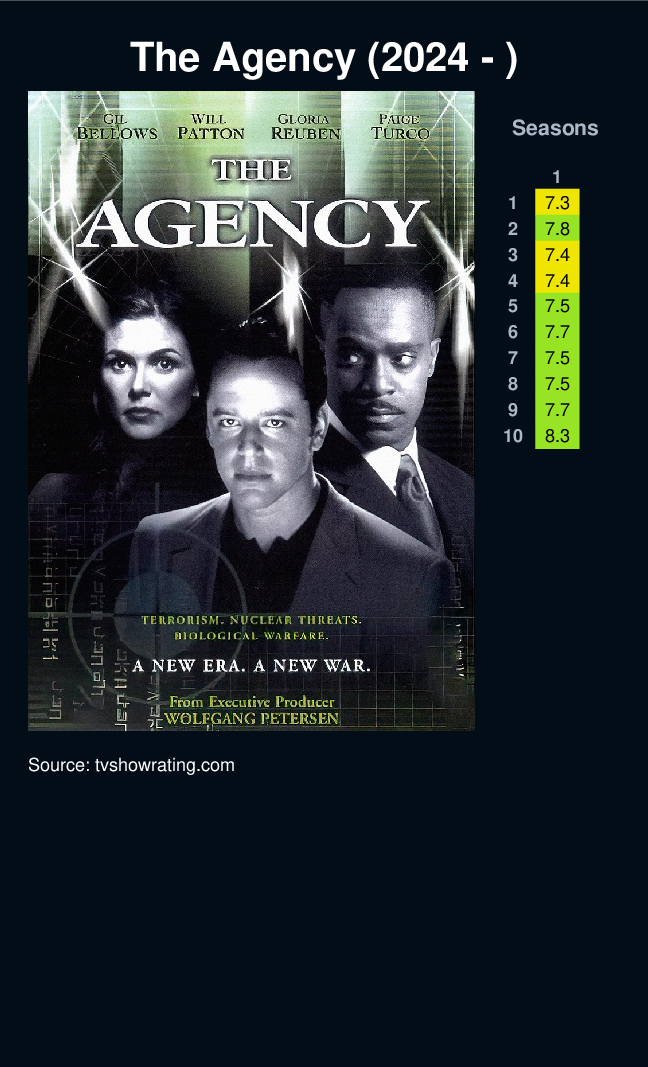 The Agency is a CBS television drama that followed the inner-workings of the CIA. The series was created by Michael Frost Beckner and was executive produced by Michael Frost Beckner, Shaun Cassidy Productions and Radiant Productions in association with Universal Network Television and CBS Productions. It aired from September 27, 2001 until May 17, 2003, lasting two seasons. It featured unprecedented filming from the actual CIA headquarters. The show was controversial regarding its exploration of current international affairs and its treatment of the ethical conflicts inherent in intelligence work. Beckner's pilot script, written in March 2001, posited a re-invented CIA tasked with a "War on Terror" after Osama Bin Laden's Al Qaeda terrorist organization plots a lethal attack on the west. The pilot was to premiere at CIA Headquarters on September 18, 2001 and set to air on CBS September 21, 2001, however, the actual 9/11 attacks convinced the network to hold the pilot and instead ai...