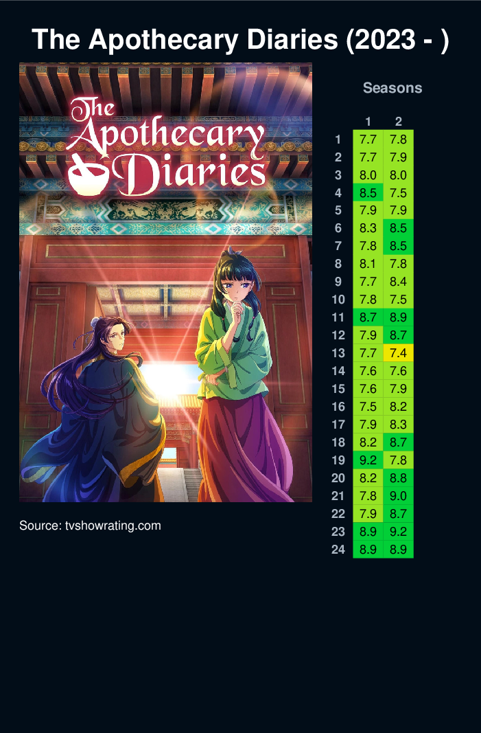 Maomao lived a peaceful life with her apothecary father. Until one day, she's sold as a lowly servant to the emperor's palace. But she wasn't meant for a compliant life among royalty. So when imperial heirs fall ill, she decides to step in and find a cure! This catches the eye of Jinshi, a handsome palace official who promotes her. Now, she's making a name for herself solving medical mysteries!