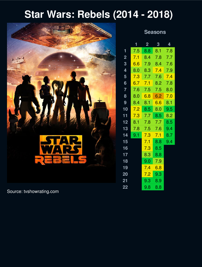 Set between the events of Star Wars: Episodes III and IV, the story unfolds during a dark time when the evil Galactic Empire is tightening its grip of power on the galaxy. Imperial forces have occupied a remote planet and are ruining the lives of its people. The motley but clever crew of the starship Ghost — cowboy Jedi Kanan, ace pilot Hera, street-smart teenager Ezra, the “muscle” Zeb, warrior firebrand Sabine, and cantankerous old astromech droid Chopper — is among a select few who are brave enough to stand against the Empire. Together, they will face threatening new villains, encounter colorful adversaries, embark on thrilling adventures, and become heroes with the power to ignite a rebellion.