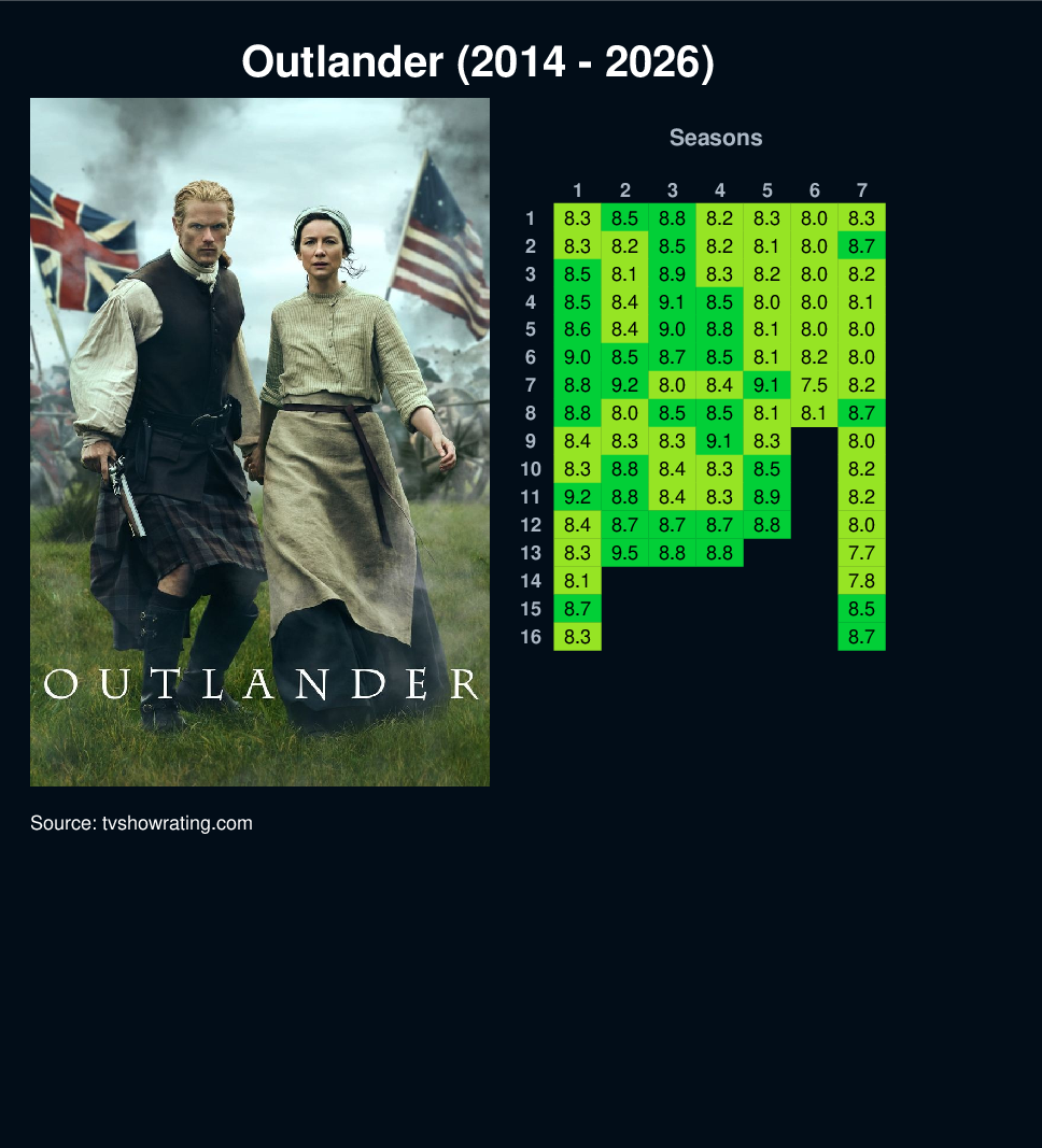 The story of Claire Randall, a married combat nurse from 1945 who is mysteriously swept back in time to 1743, where she is immediately thrown into an unknown world where her life is threatened. When she is forced to marry Jamie, a chivalrous and romantic young Scottish warrior, a passionate affair is ignited that tears Claire's heart between two vastly different men in two irreconcilable lives.