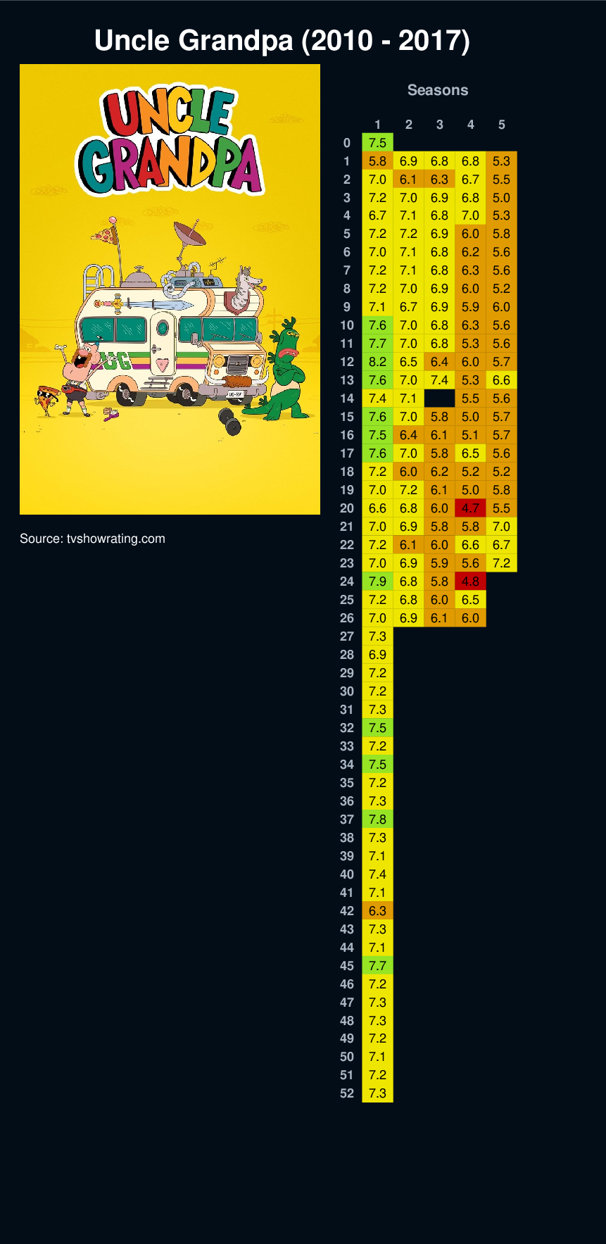 | 5 | 7.2 | 7.2 | 6.9 | 6.0 | 5.8 | ||||||||||||||||||||||||||||||||||||||||||||