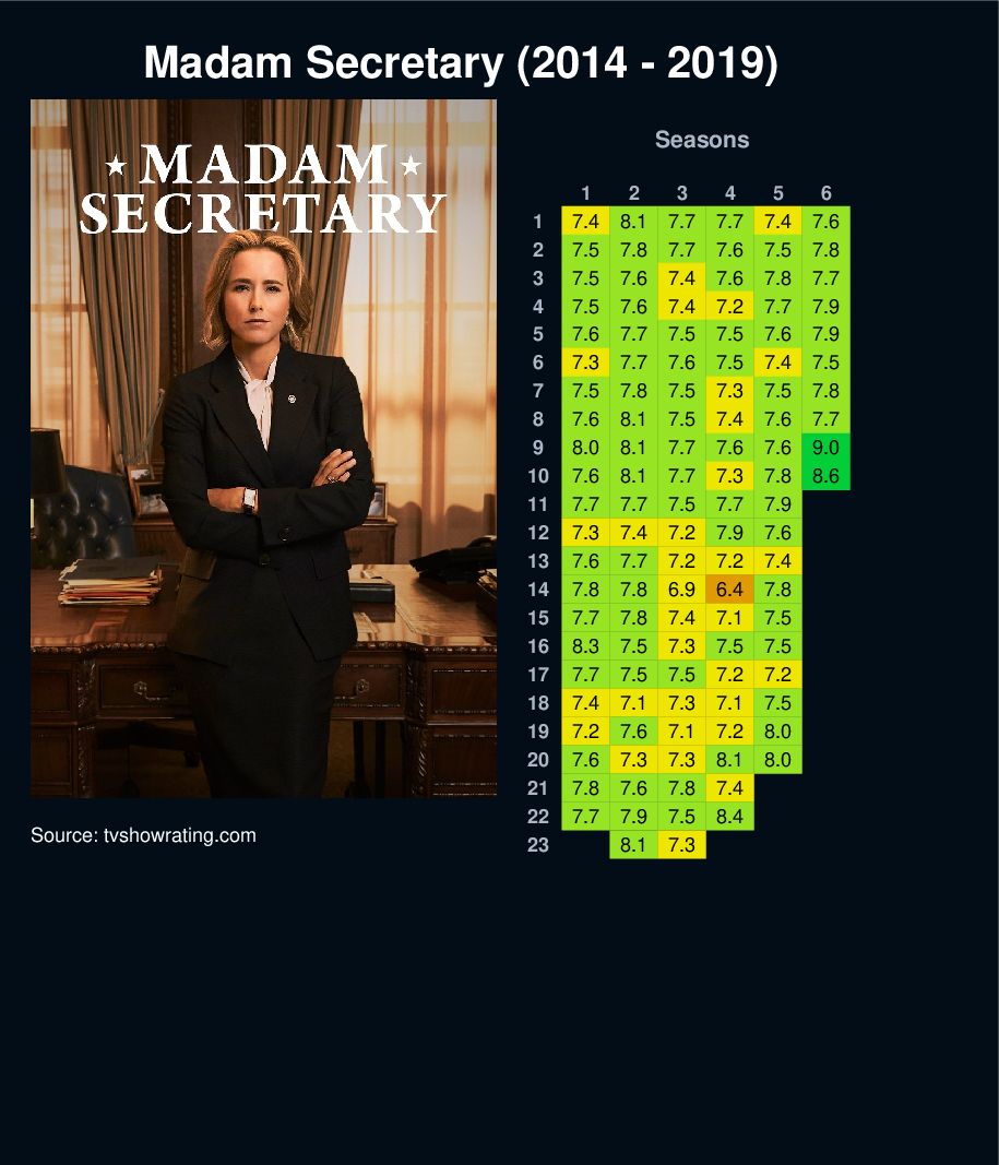 | 6 | 7.3 | 7.7 | 7.6 | 7.5 | 7.4 | 7.5 | |||||||||||||||||||||||||||||||||||||||||||