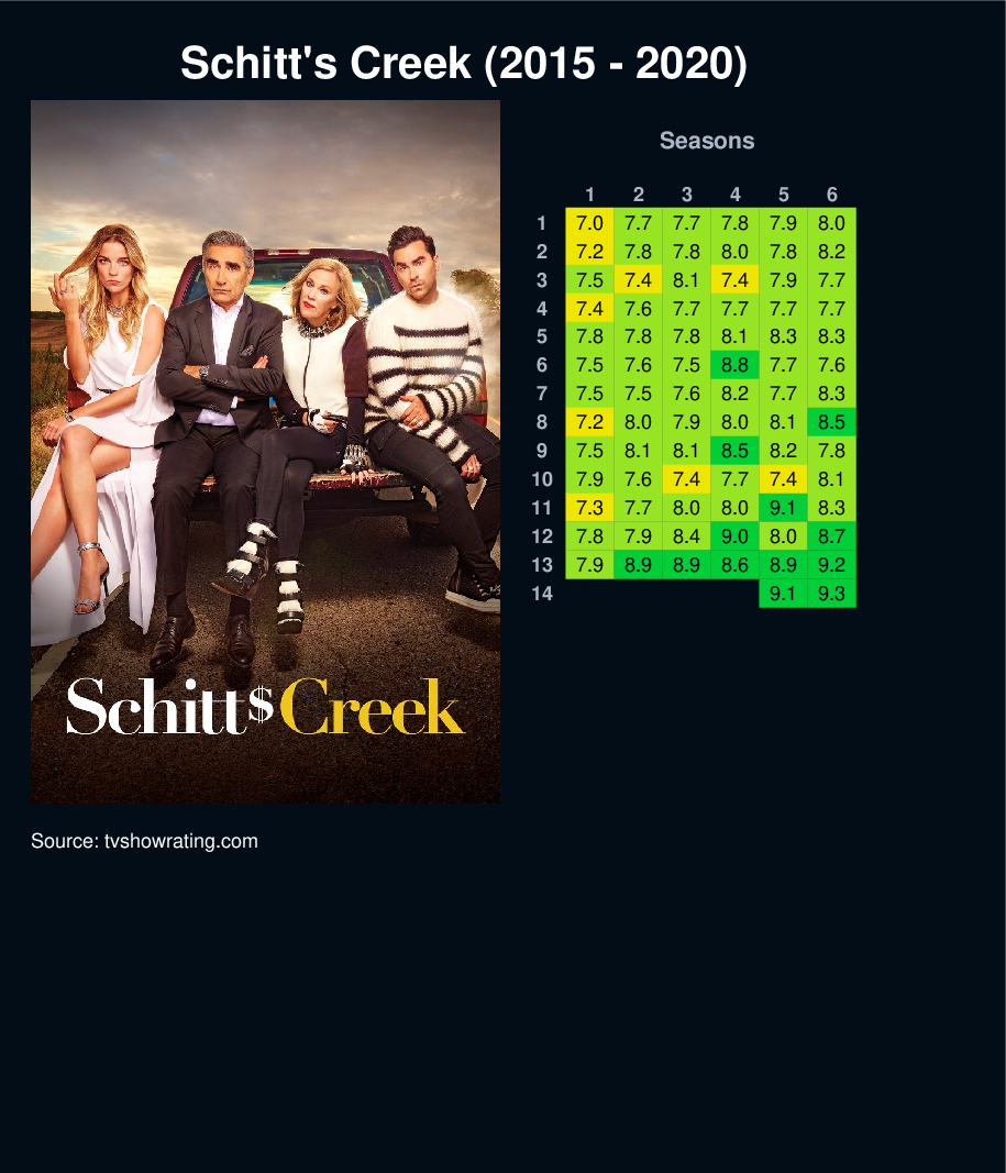 Formerly filthy rich video store magnate Johnny Rose, his soap star wife Moira, and their two kids, über-hipster son David and socialite daughter Alexis, suddenly find themselves broke and forced to live in Schitt's Creek, a small depressing town they once bought as a joke.