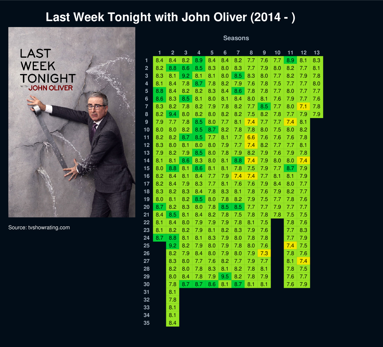 | 5 | 8.8 | 8.4 | 8.2 | 8.2 | 8.3 | 8.4 | 8.6 | 7.8 | 7.8 | 7.7 | 8.0 | 7.7 | 7.7 | ||||||||||||||||||||||||||||||||||||
