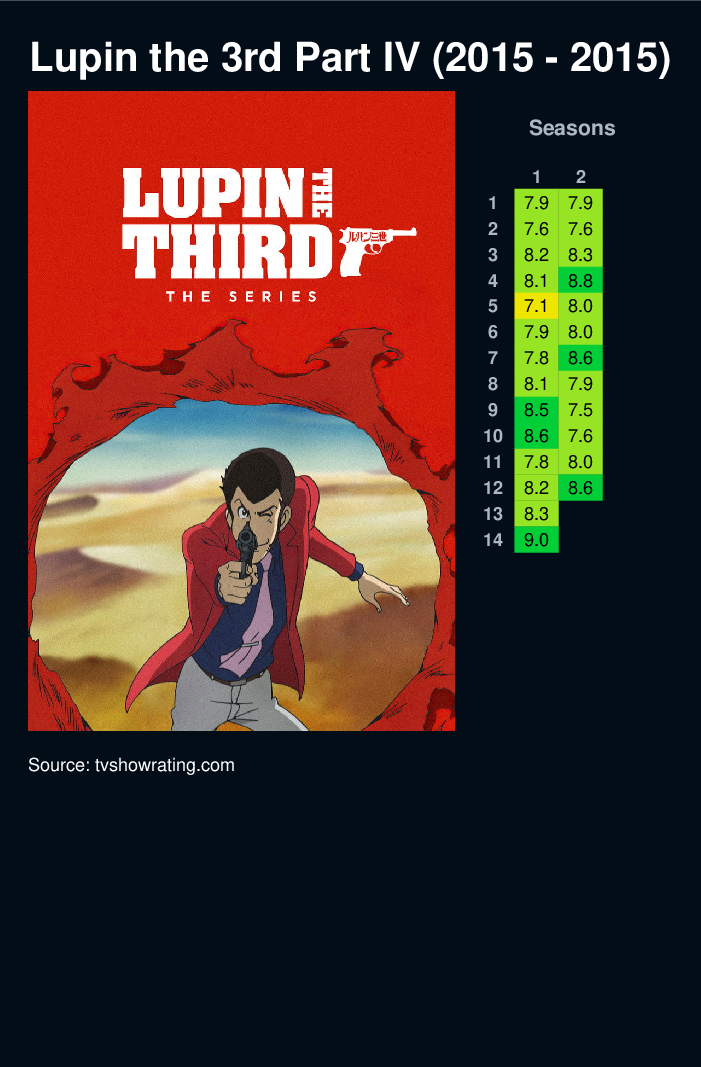 Follow the exciting adventures of Arsene Lupin III, the grandson of the world's greatest thief, Arsene Lupin. Together with Daisuke Jigen, Goemon Ishikawa and his love interest Fujiko Mine, he carries out the greatest robberies of all time, all the while evading the control of Inspector Koichi Zenigata.