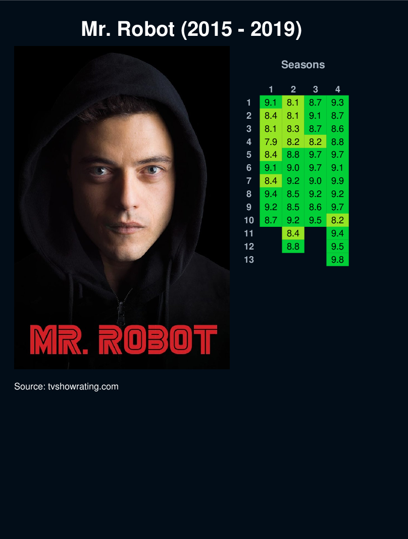 A contemporary and culturally resonant drama about a young programmer, Elliot, who suffers from a debilitating anti-social disorder and decides that he can only connect to people by hacking them. He wields his skills as a weapon to protect the people that he cares about. Elliot will find himself in the intersection between a cybersecurity firm he works for and the underworld organizations that are recruiting him to bring down corporate America.