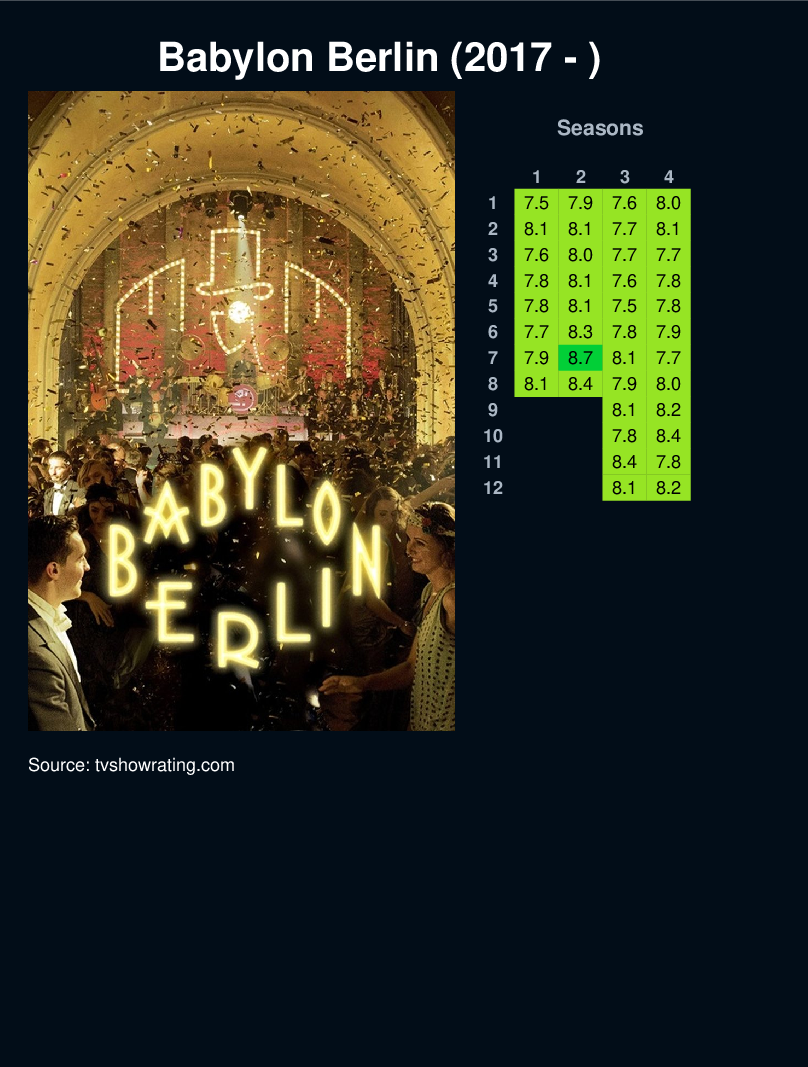 Beneath the decadence of 1929 Berlin, lies an underworld city of sin. Police investigator Gereon Rath has been transferred from Cologne to the epicenter of political and social changes in the Golden Twenties.
