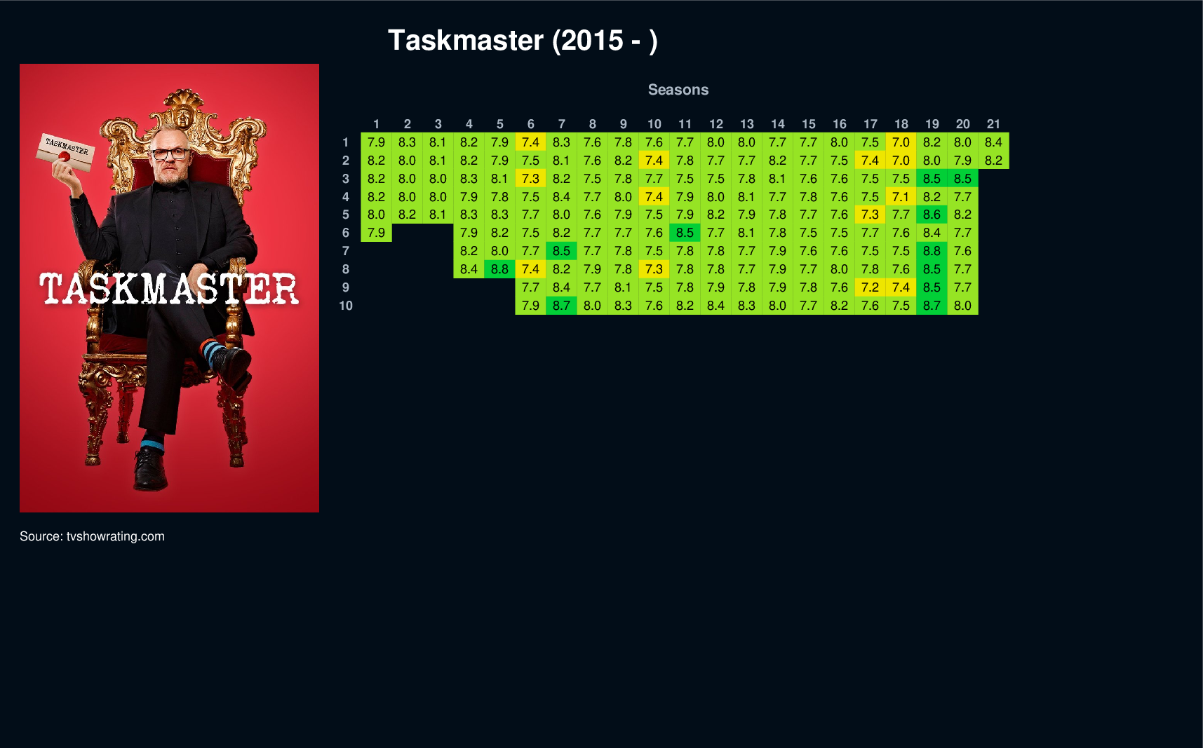 Greg Davies is the Taskmaster, and with the help of his ever-loyal assistant Alex Horne, they will set out to test the wiles, wit, wisdom and skills of five hyper-competitive comedians. Who will be crowned the Taskmaster champion?