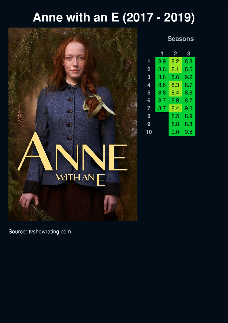 A coming-of-age story about an outsider who, against all odds and numerous challenges, fights for love and acceptance and for her place in the world. The series centers on a young orphaned girl in the late 1890s, who, after an abusive childhood spent in orphanages and the homes of strangers, is mistakenly sent to live with an elderly woman and her aging brother. Over time, 13-year-old Anne will transform their lives and eventually the small town in which they live with her unique spirit, fierce intellect and brilliant imagination.