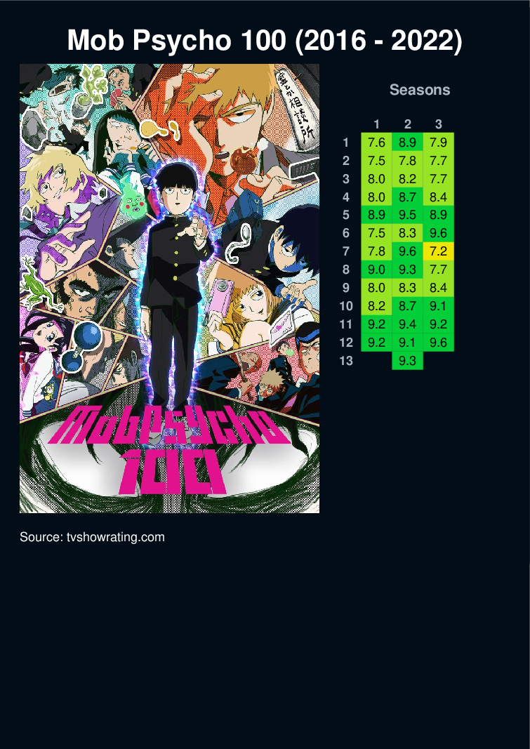 Shigeo Kageyama, a.k.a. "Mob," is a boy who has trouble expressing himself, but who happens to be a powerful esper. Mob is determined to live a normal life and keeps his ESP suppressed, but when his emotions surge to a level of 100%, something terrible happens to him! As he's surrounded by false espers, evil spirits, and mysterious organizations, what will Mob think? What choices will he make?