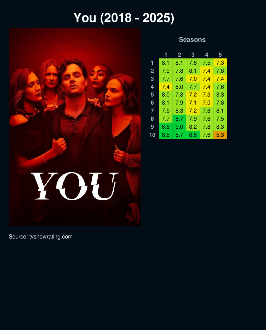 | 5 | 8.0 | 7.8 | 7.2 | 7.3 | 8.3 | ||||||||||||||||||||||||||||||||||||||||||||