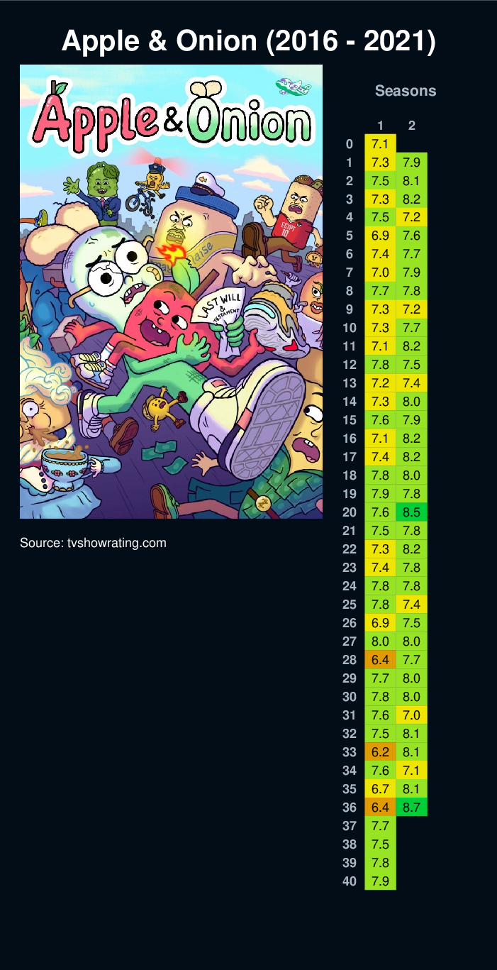 In a world of talking food, best mates Apple and Onion fumble through city life, tackling ordinary problems by extraordinary means.