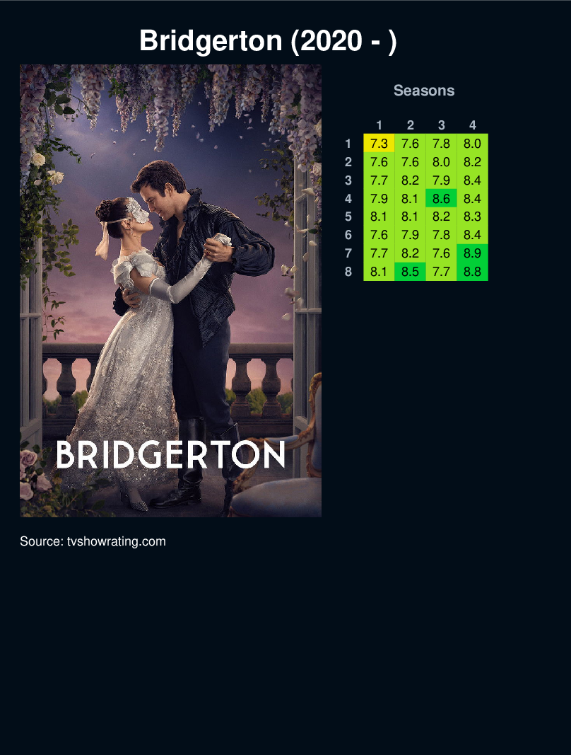 Wealth, lust, and betrayal set in the backdrop of Regency era England, seen through the eyes of the powerful Bridgerton family.