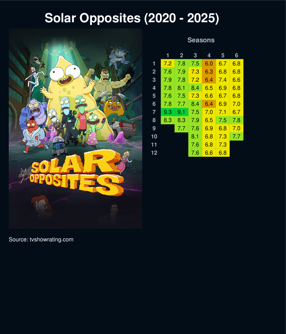 | 6 | 7.8 | 7.7 | 8.4 | 6.4 | 6.9 | 7.0 | |||||||||||||||||||||||||||||||||||||||||||