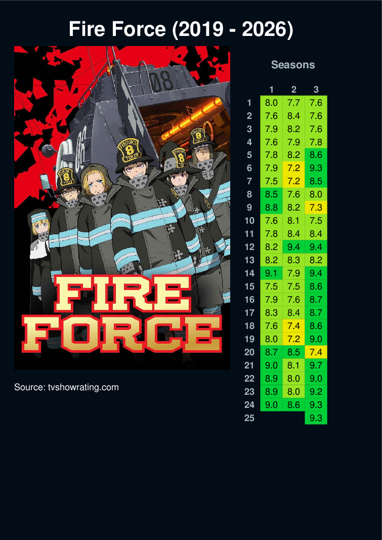 Year 198 of the Solar Era in Tokyo, special fire brigades are fighting against a phenomenon called spontaneous human combustion where humans beings are turned into living infernos called "Infernals". While the Infernals are first generation cases of spontaneous human combustion, later generations possess the ability to manipulate flames while retaining human form. Shinra Kusakabe, a youth who gained the nickname Devil's Footprints for his ability to ignite his feet at will, joins the Special Fire Force Company 8 which composes of other flames users as they work to extinguish any Infernals they encounter. As a faction that is creating Infernals appears, Shira begins to uncover the truth behind a mysterious fire that caused the death of his family twelve years ago.